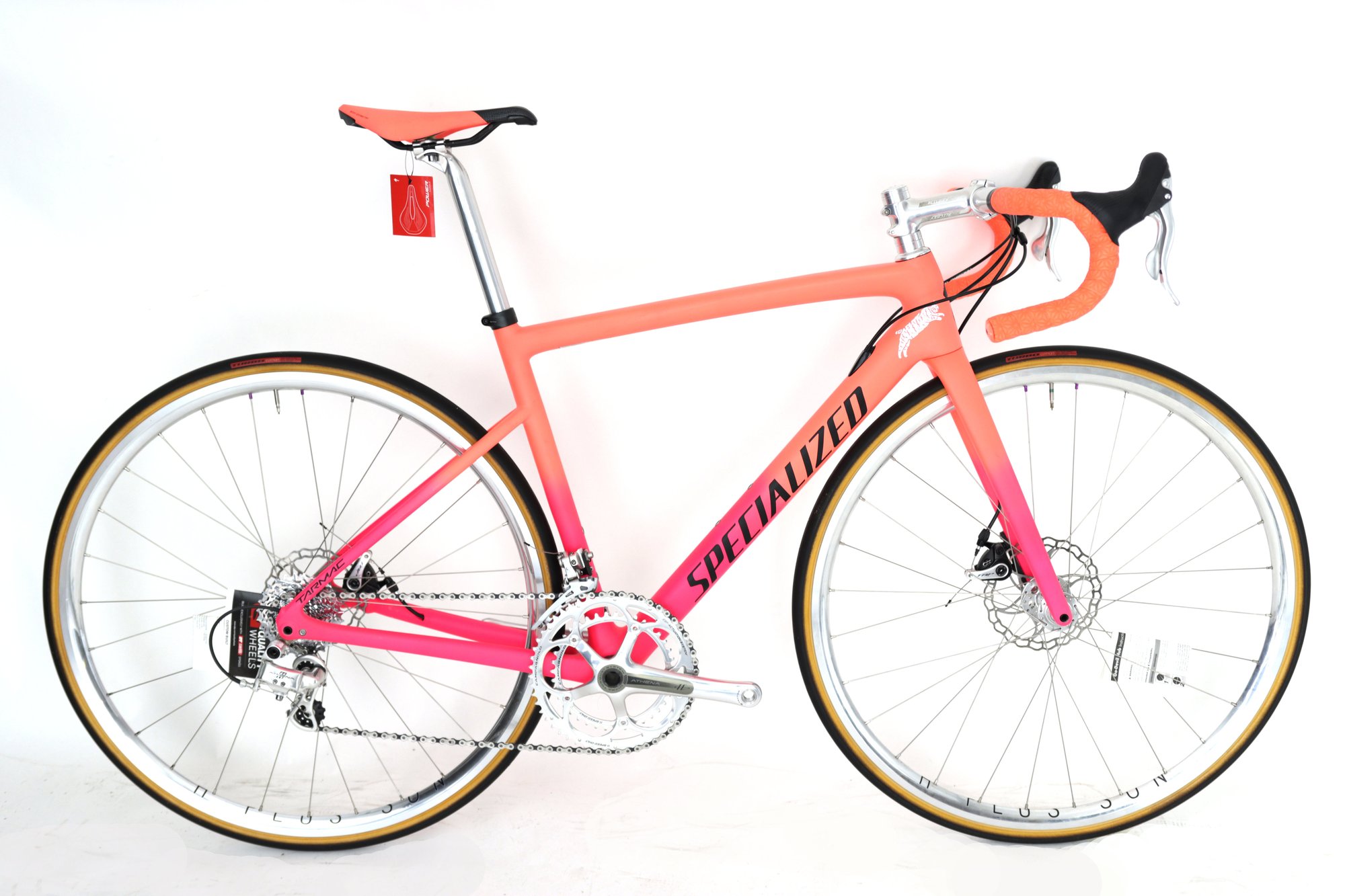 This is a wild one! Personally my favorite one I’ve ever built. I bought this SL6 frame from specialized in 2019, back when they used to offer paint samples to dealers. I collected the parts over a few years, it took a while to find the acid pink (coral) saddle, the supacaz tape was discontinued and matches perfectly. The wheels were hand built at QBP (tags with the builders name and ax specs attached)